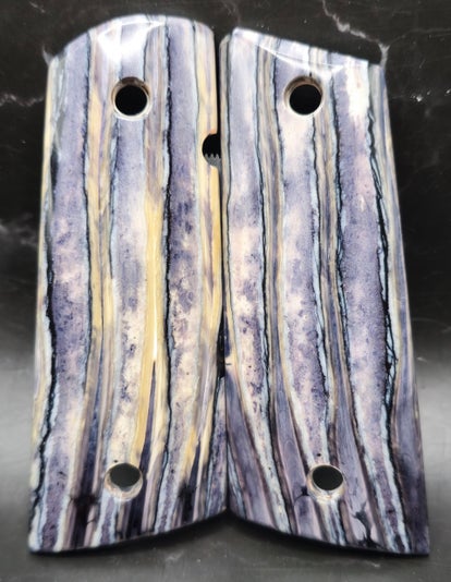 This extraordinary set of Mammoth Molar grips is truly one-of-a-kind, featuring a stunning cream color with blue/purplish streaks running vertically through the molar. The unique coloration is unlike anything seen before, making these grips a standout piece for any firearms enthusiast.