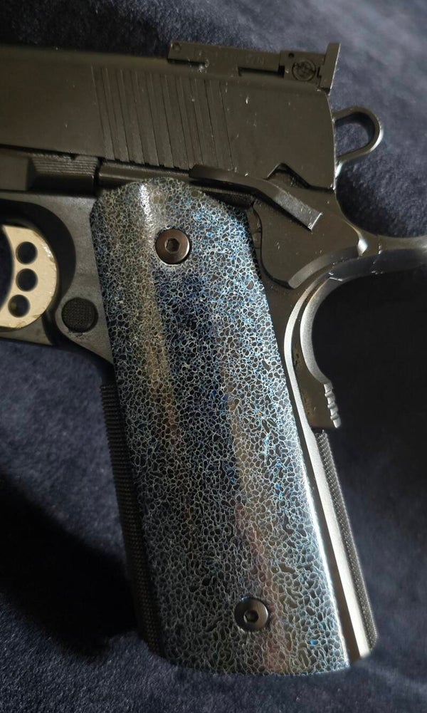 Very unique 1911 grips. Each grip has a slightly differnet pattern to them. The grips come from the spinal bone of a whale. This set had been dyed blue. Its a stunning set that really would show well on a stainless gun.