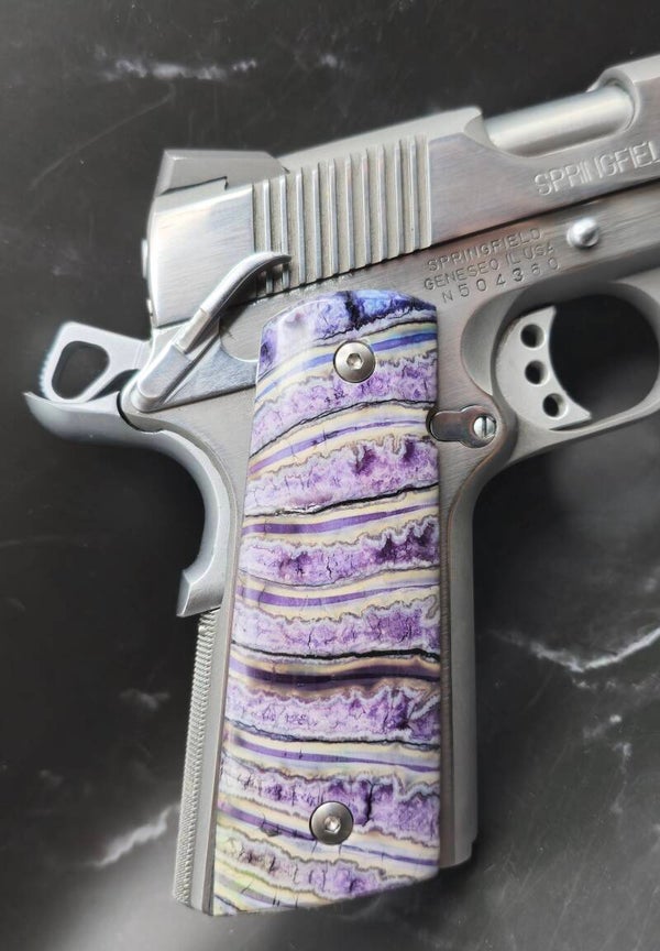 Light purple with a hint of green Woolly Mammoth Molar. If you like purple this is a very attractive set. Subtle soothing purple colors. This Woolly Mammoth molar has been sitting in the ground 15,000-30,000. Shown a black and Stainless gun. These are cut to accomidate a magwell. And have carbon fiber backing.