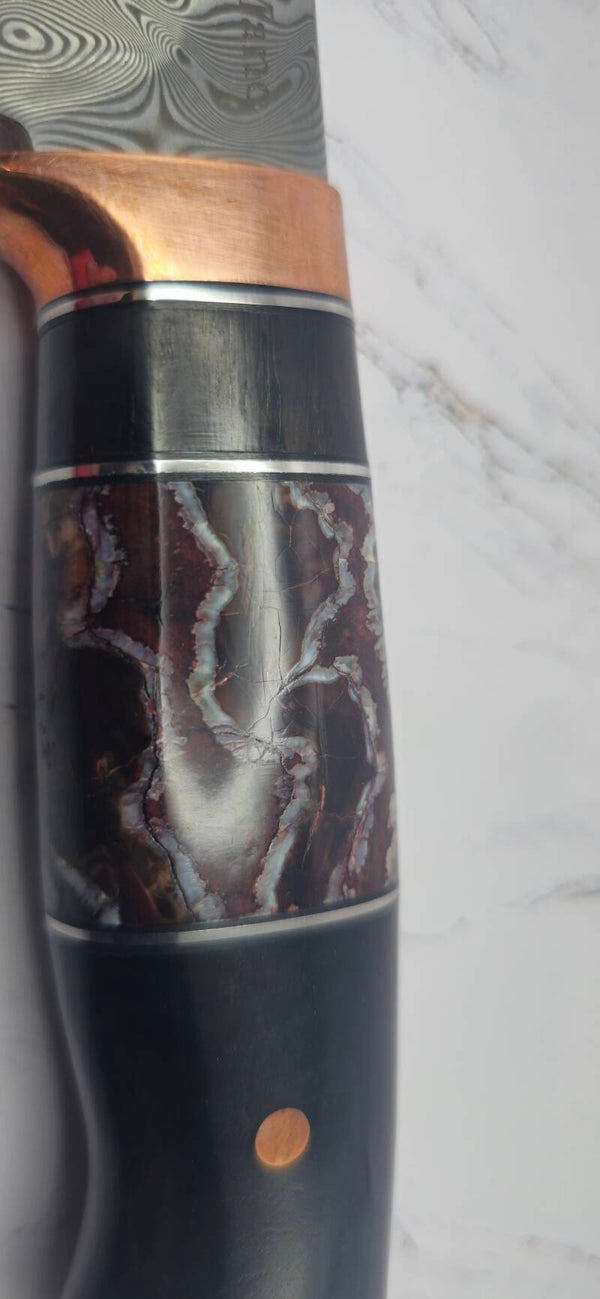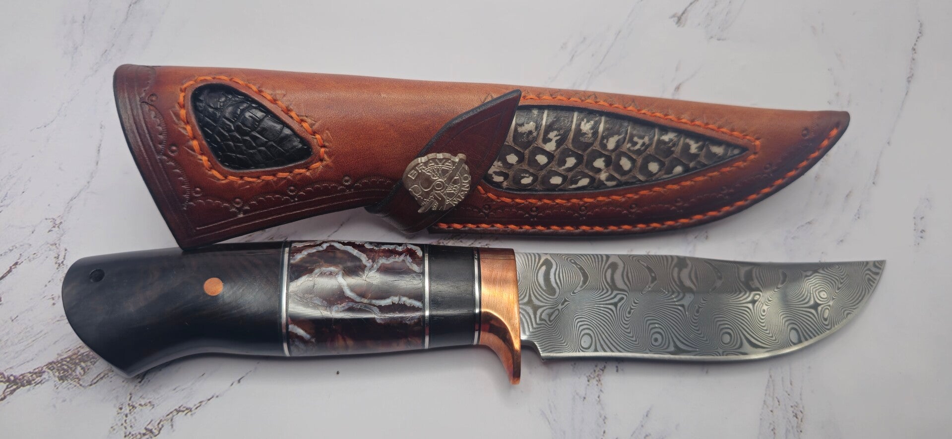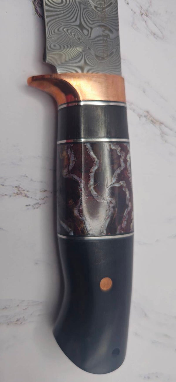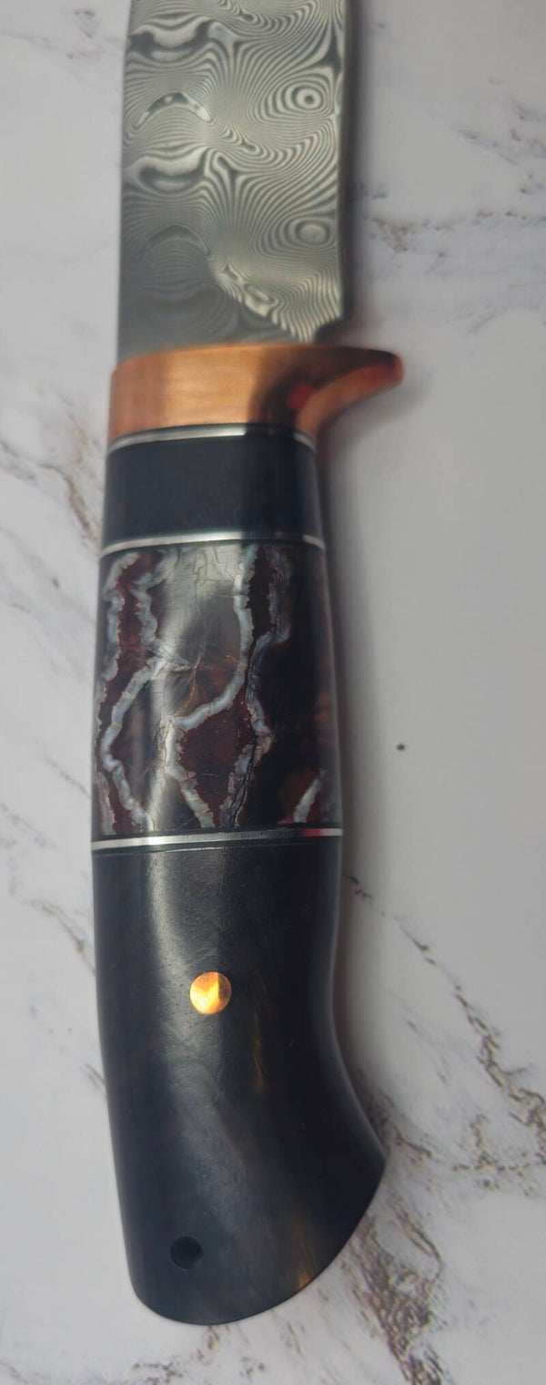 Stainless steel Damascus Hunter knife with ironwood handle and brown/ red Woolley Mammoth molar with Copper guards and pins. This knife comes with a snake and aligator skin inserts on a leather sheath. See pictures for more detail.