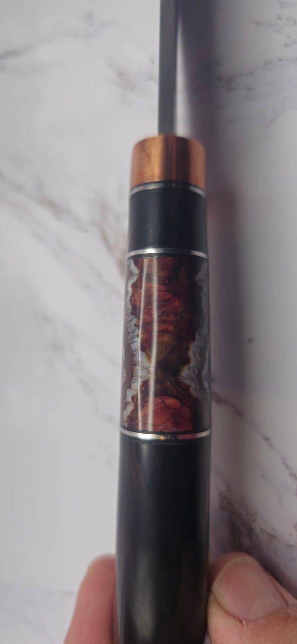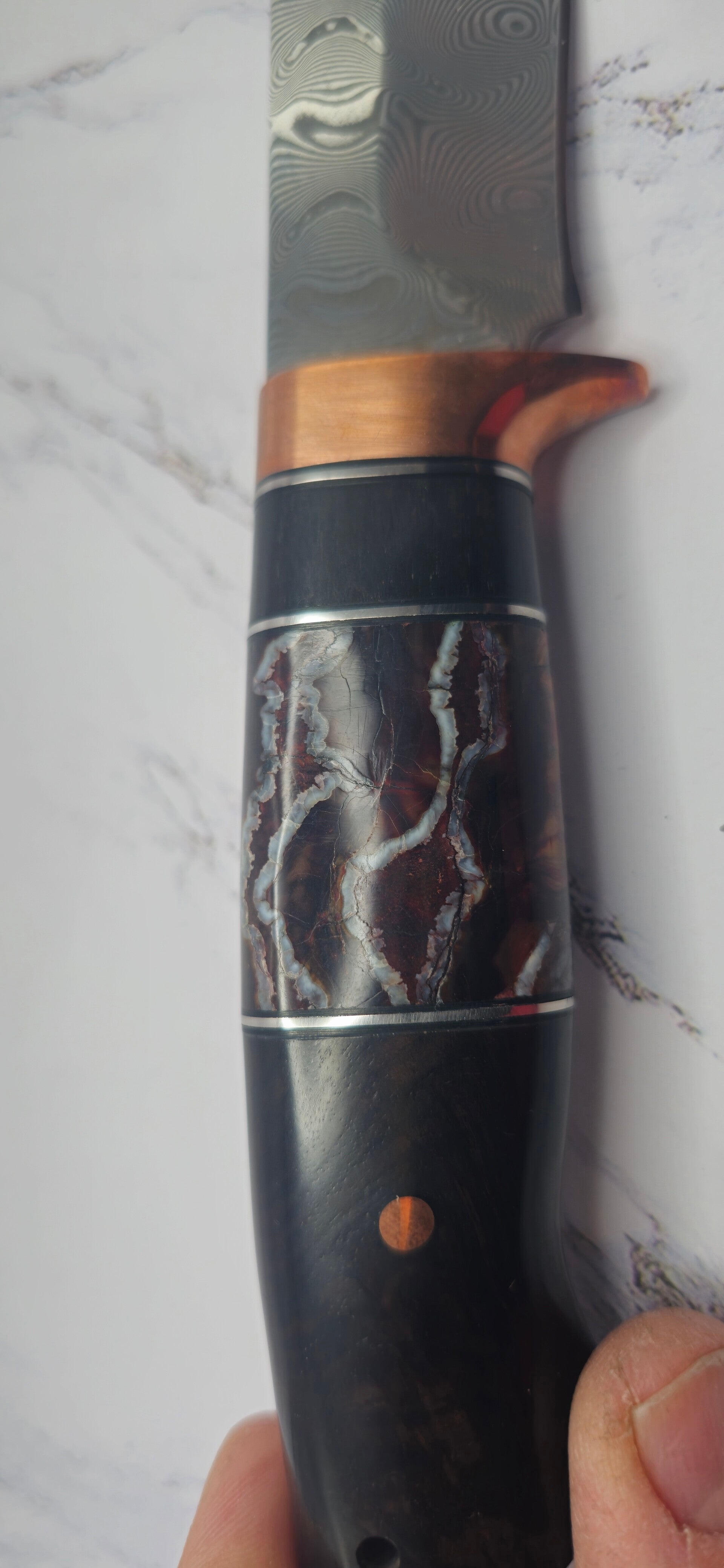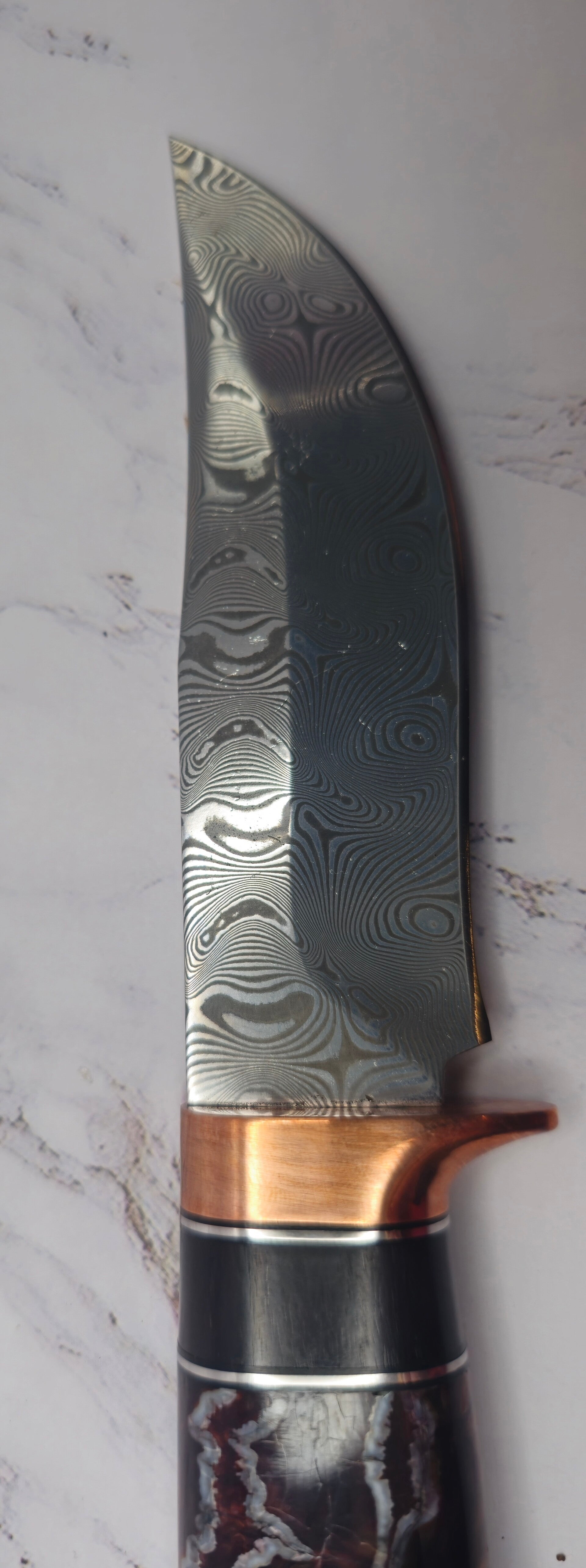 Stainless steel Damascus Hunter knife with ironwood handle and brown/ red Woolley Mammoth molar with Copper guards and pins. This knife comes with a snake and aligator skin inserts on a leather sheath. See pictures for more detail.