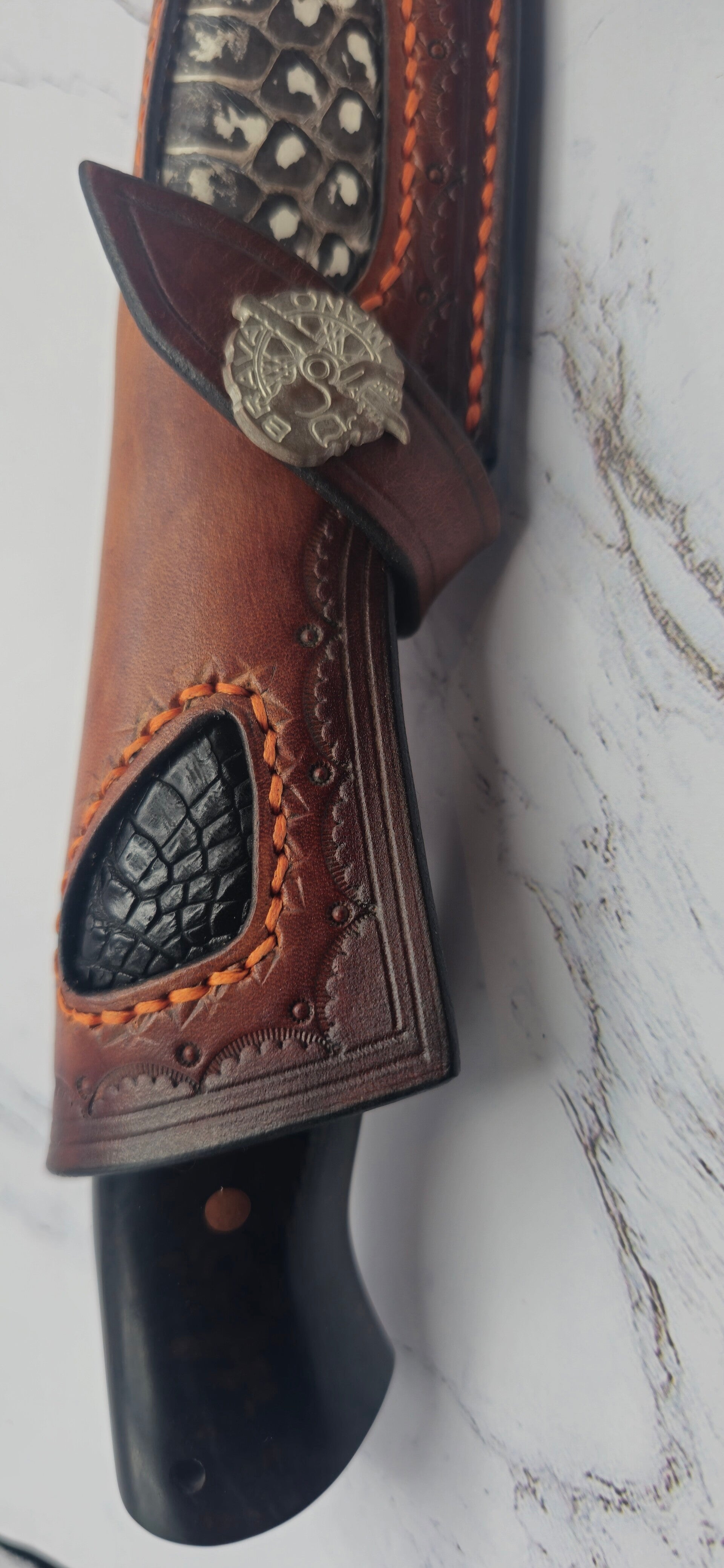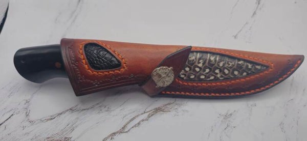 Stainless steel Damascus Hunter knife with ironwood handle and brown/ red Woolley Mammoth molar with Copper guards and pins. This knife comes with a snake and aligator skin inserts on a leather sheath. See pictures for more detail.