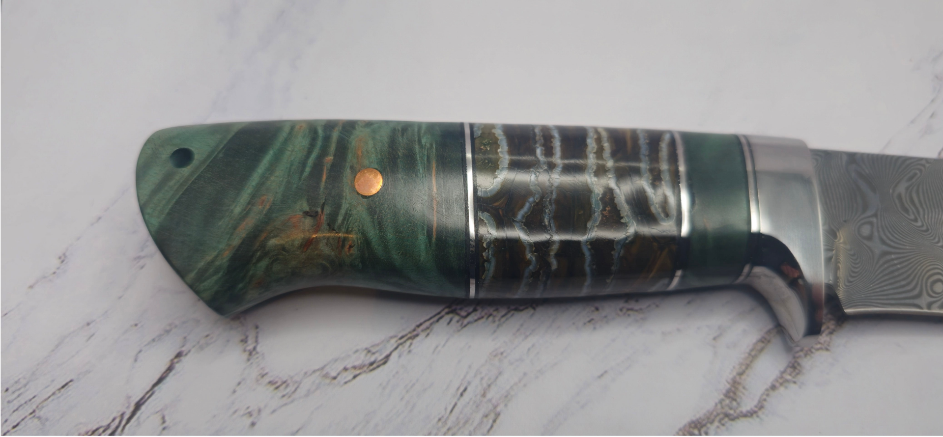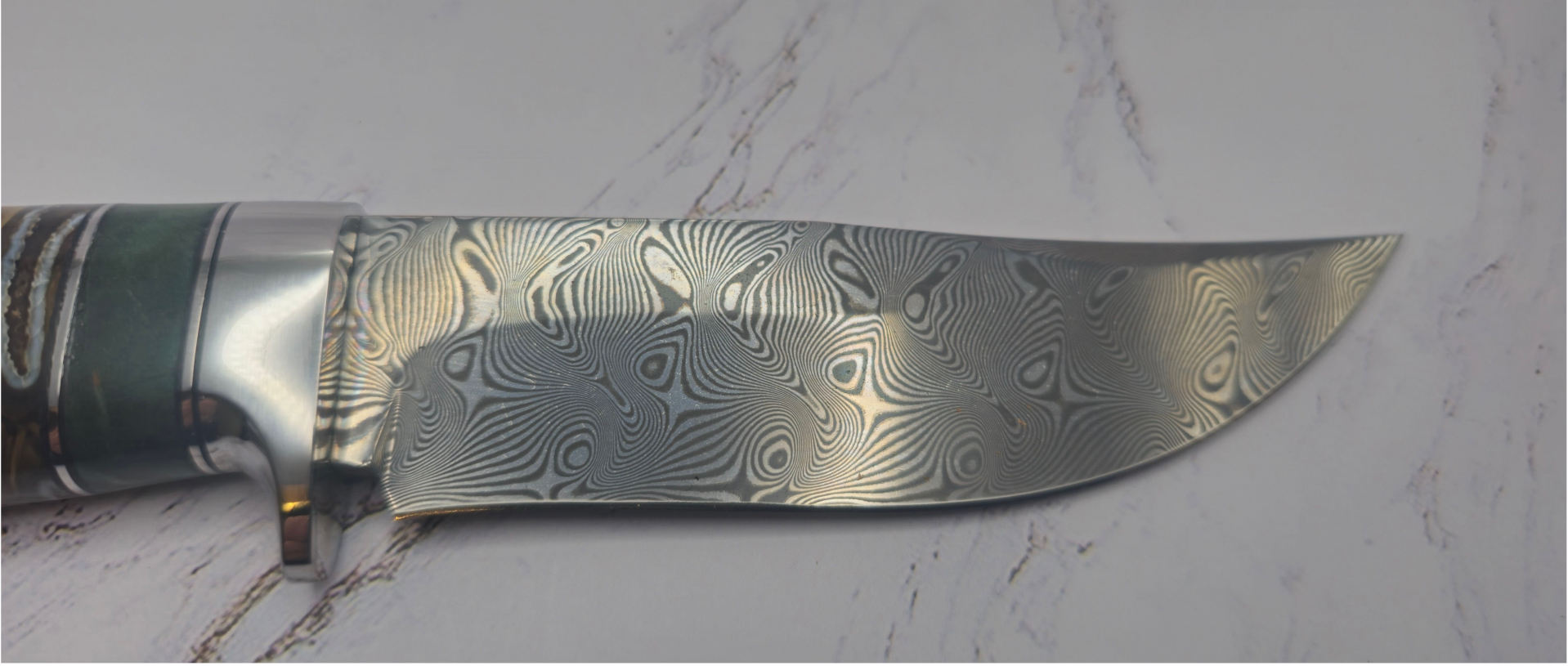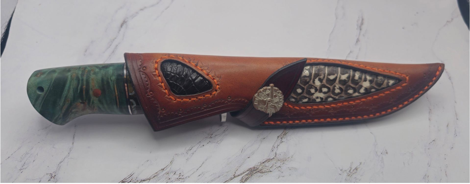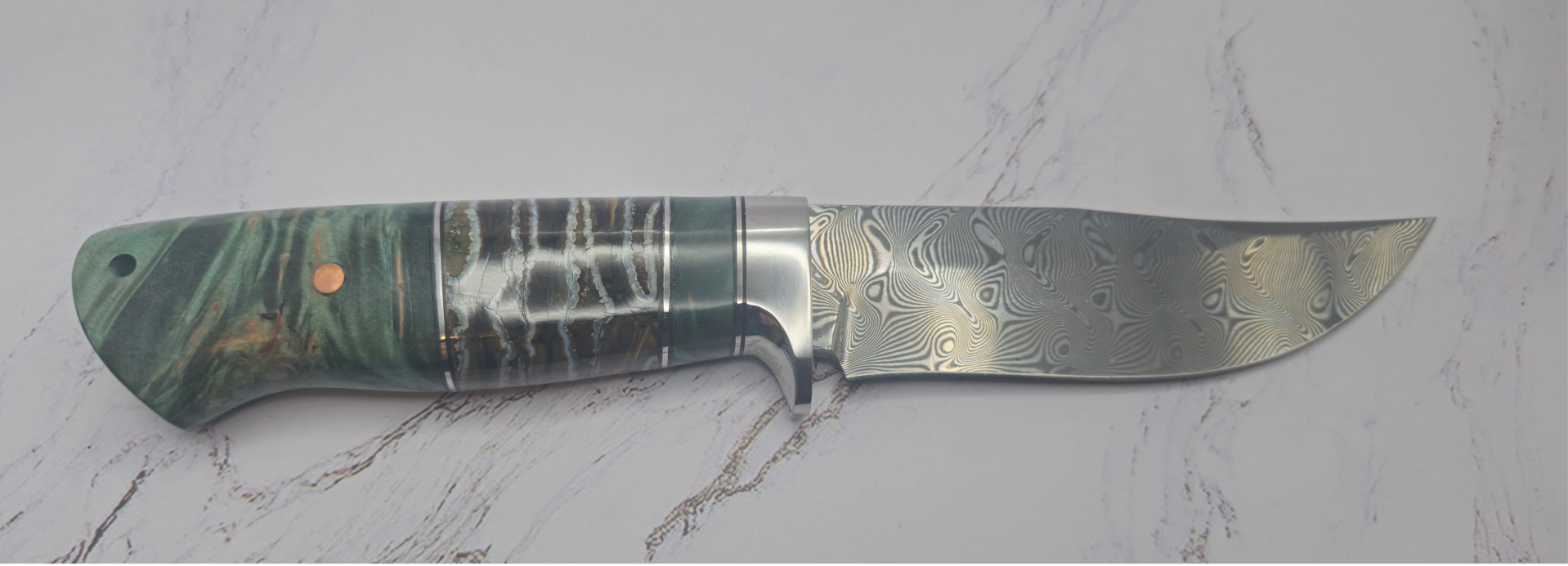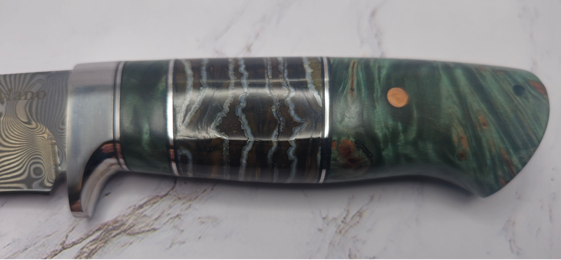 Stainless steel Damascus Hunter knife with green stabalized burlwood handle and brown Woolley Mammoth molar with silver bolster. This knife comes with a snake and aligator skin inserts on a leather sheath. See pictures for more detail.
