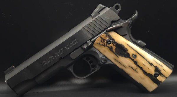 Enhance your Government or Commander size 1911 with our stunning grips, showcasing beautiful bark patterning in a medium cream/tan color. The black vein/bark serrations add a striking contrast, highlighting the natural beauty of the aged Woolly Mammoth ivory. This material has been preserved for an impressive 15,000 plus years, imbuing the grips with a unique historical significance.