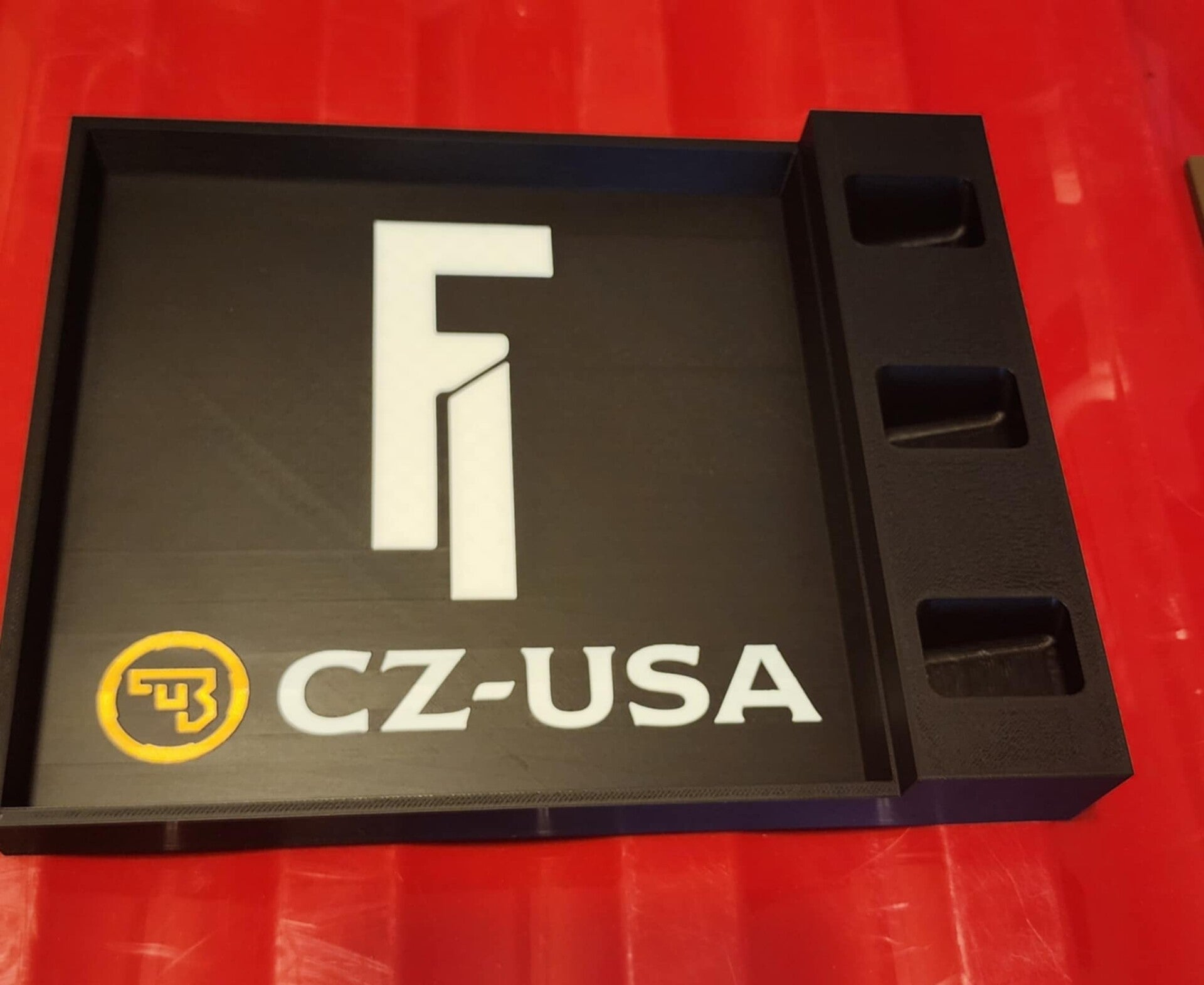 This stand comes with a open tray that can be used to hold parts, display your company logo or gun brand logo. You also get a mag holder that can hold up to 3 items.