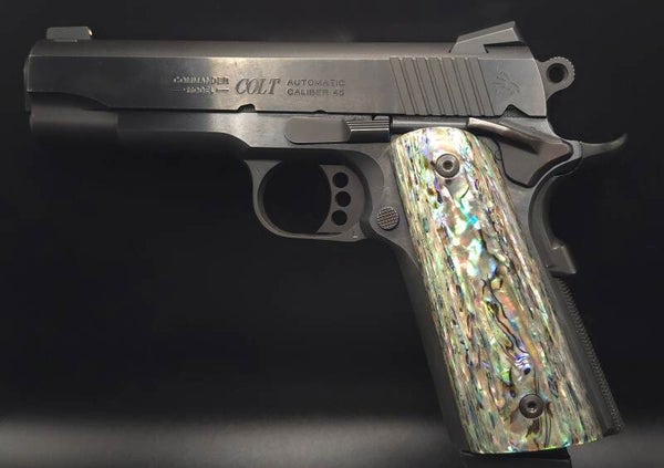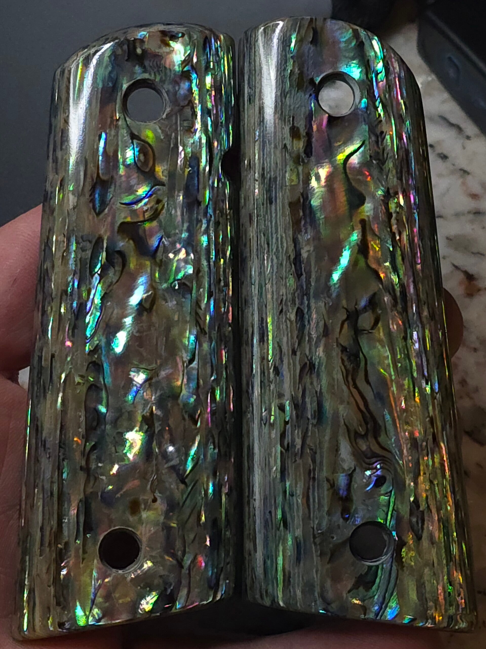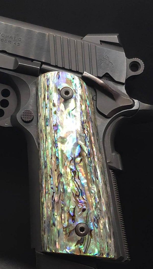 We proudly present a truly unique and exclusive set of natural Abalone shell grips, crafted from the finest, full Abalone shells. Unlike common alternatives that merely encase a thin cross-section in resin, these grips are made from genuine, full Abalone shells—no resin needed. This rarity makes them a true treasure for collectors and connoisseurs. These are made to fit a 1911 Government or Commander frame.