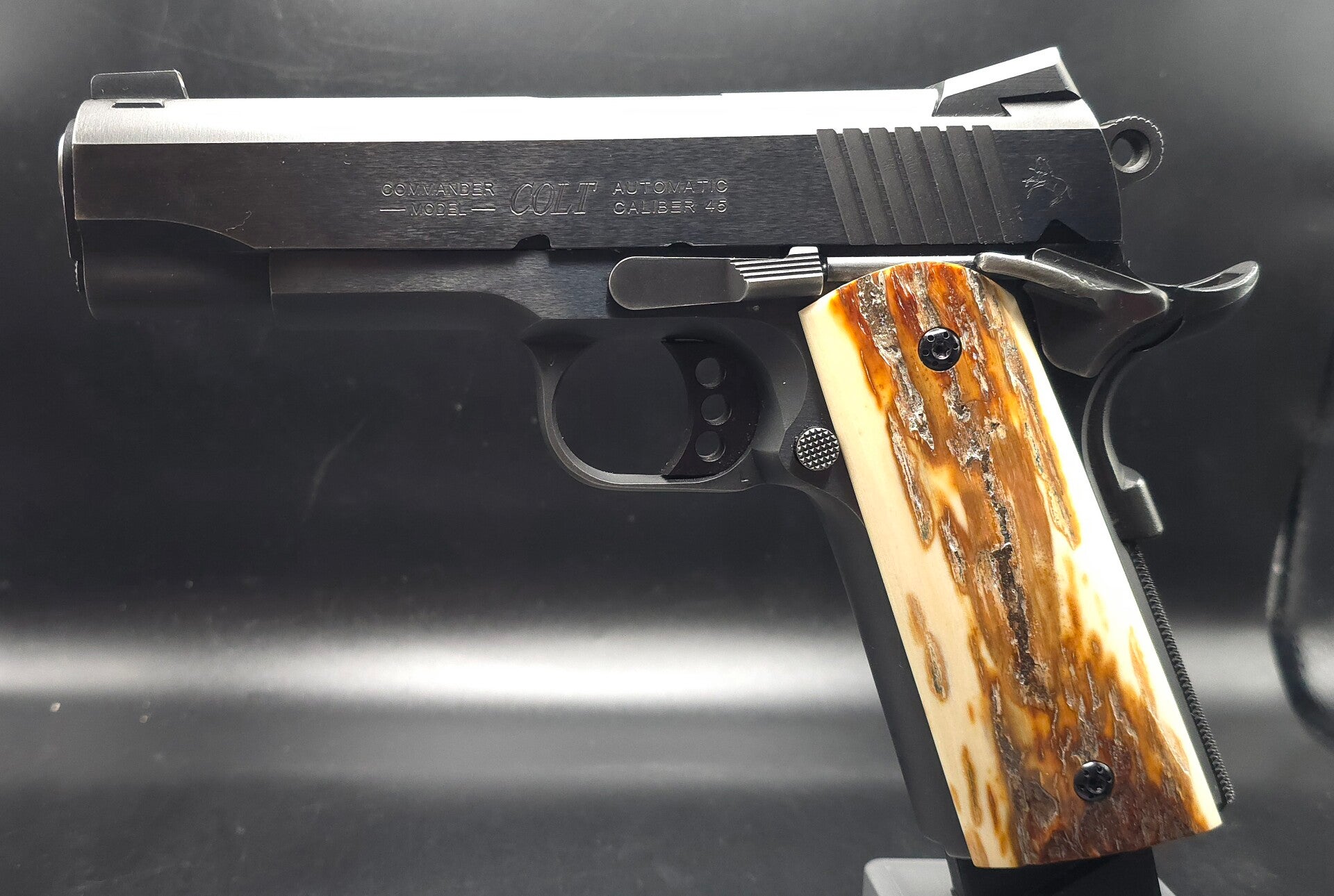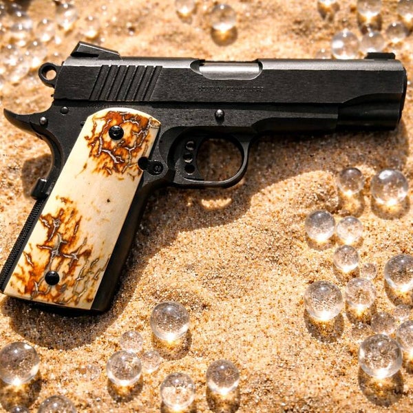 Upgrade your Government or Commander model 1911 with these premium grips, expertly crafted from genuine white Woolly Mammoth ivory with natural bark. Each grip showcases a classic white ivory base beautifully accented by warm brown tones, highlighting the unique character and ancient origins of the material. Individually shaped and polished, these grips offer a perfect fit and a timeless look, making your 1911 stand out with the elegance and rarity of authentic Mammoth ivory.