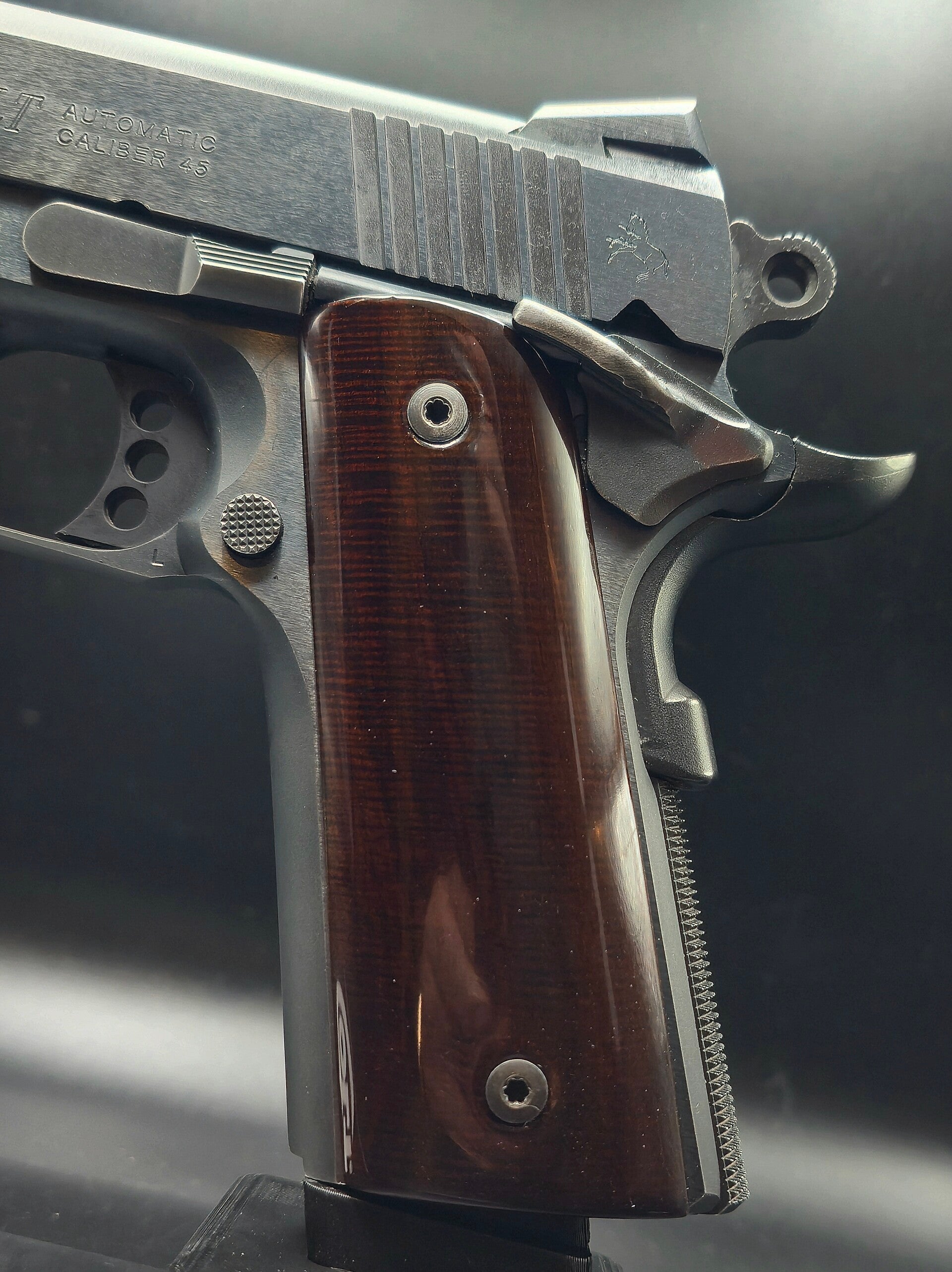 Rosewood’s rich color, tight grain, and natural oil content give it a smooth, lustrous finish that stands out in any collection. The super tight curl not only enhances the visual appeal but also reflects the rarity and artistry of the material. By adding these grips to your 1911, you elevate both its functionality and its status as a showpiece of fine craftsmanship.