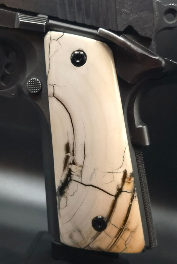 Elevate your Colt Government or commander sized 1911 with this stunning set of crosscut Mammoth Ivory grips. These cream-colored ivory features beautiful creamy and black rings creating a visually striking effect. To ensure durability and stability, the tusk has been carefully stabilized with resin.
