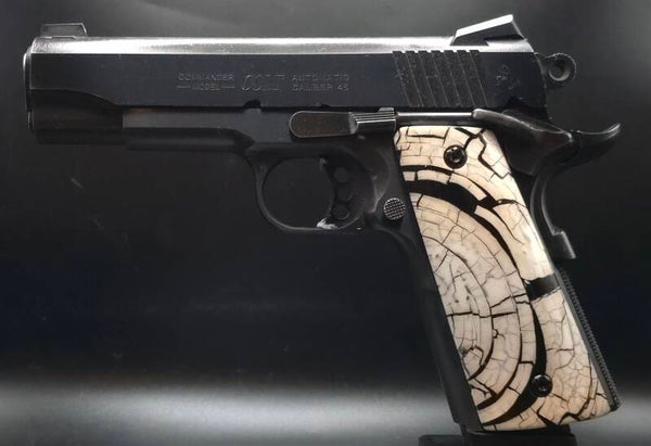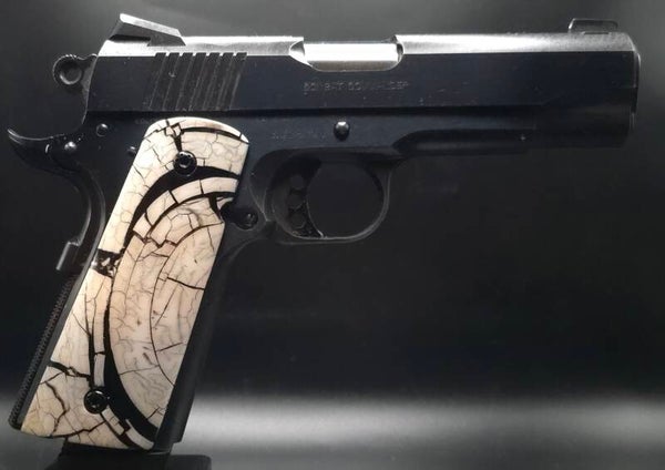 Enhance your Government or Commander-sized 1911 with these extraordinary grips, crafted from cross-cut Woolly Mammoth ivory. Featuring a striking white base color adorned with intricate black spiderweb patterns, these grips combine timeless elegance with unique natural artistry. The fossilized ivory material, preserved for over 15,000 years, carries both historical significance and unmatched visual appeal.
