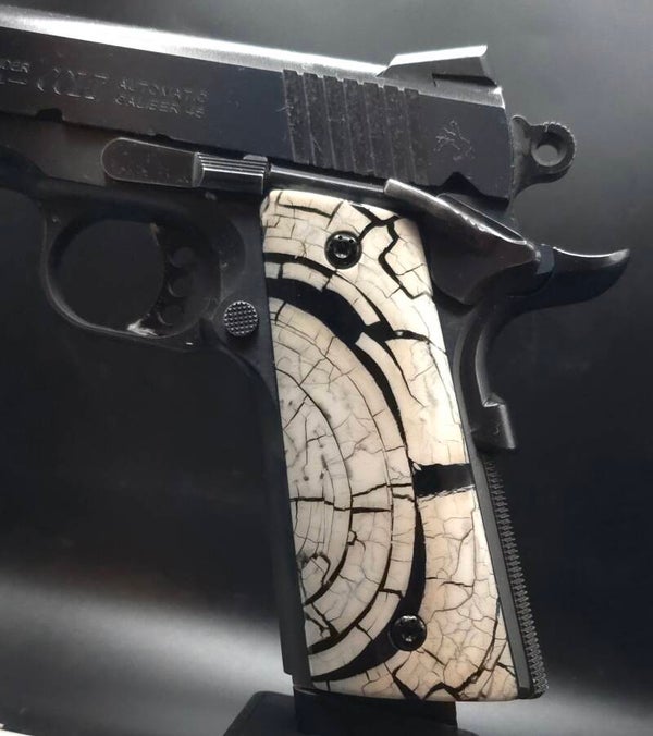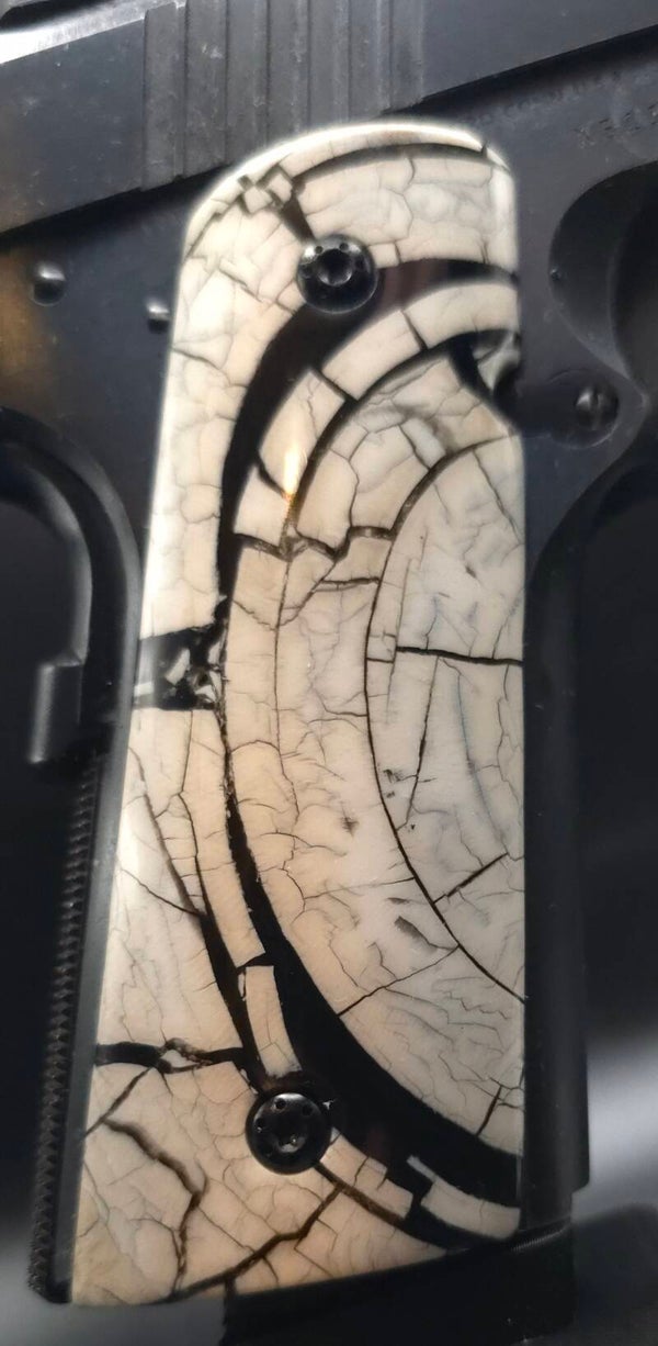 Distinctive Aesthetic: The clean white ivory base paired with intricate black web-like streaks creates a dramatic and sophisticated look that transforms any 1911 into a showpiece.
