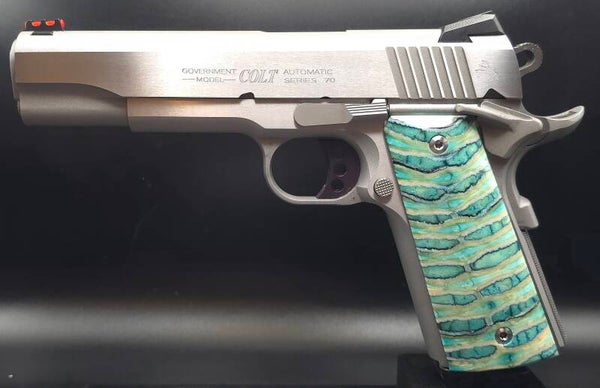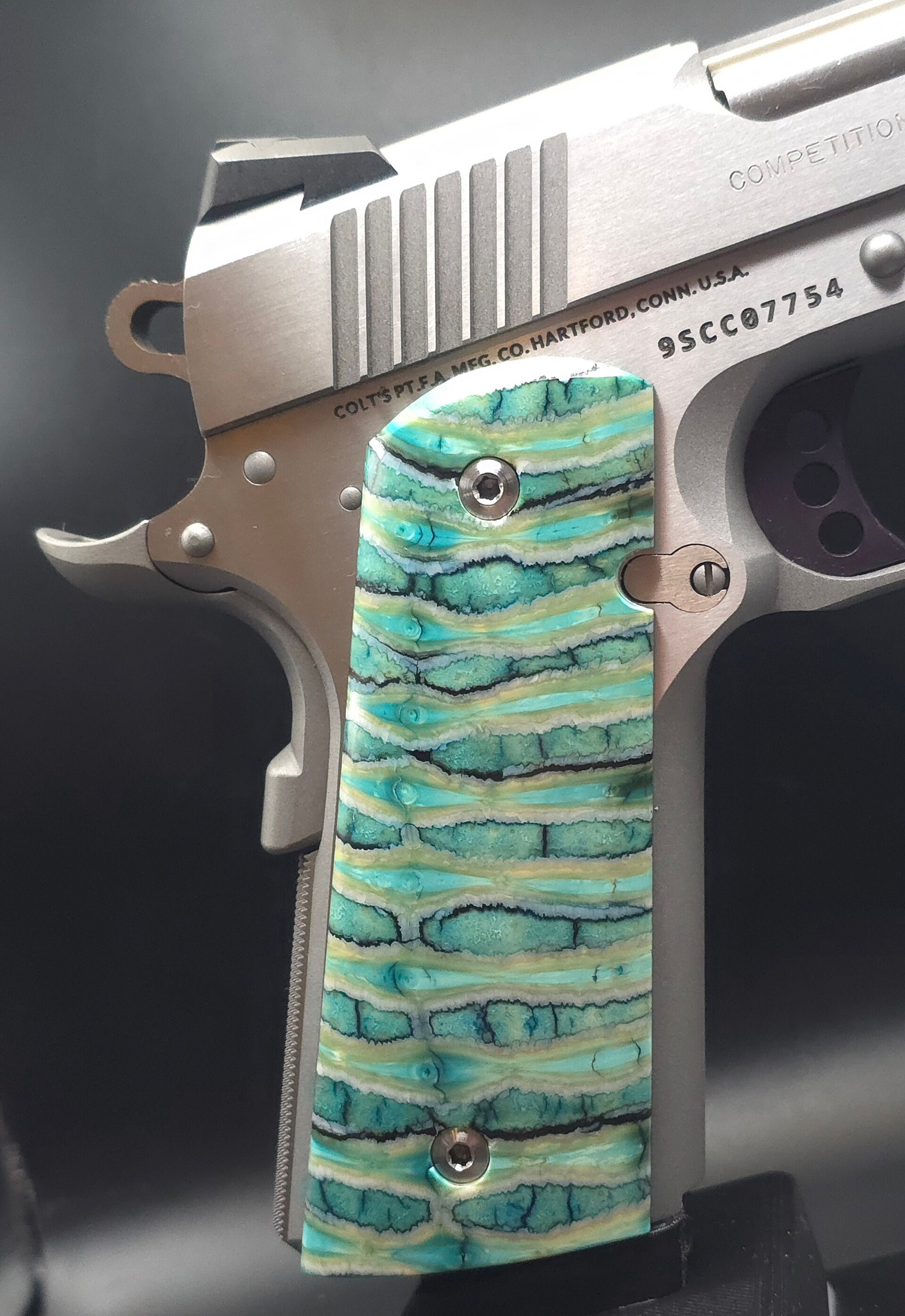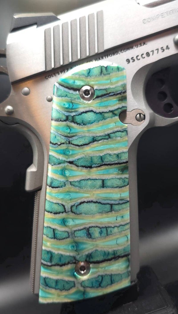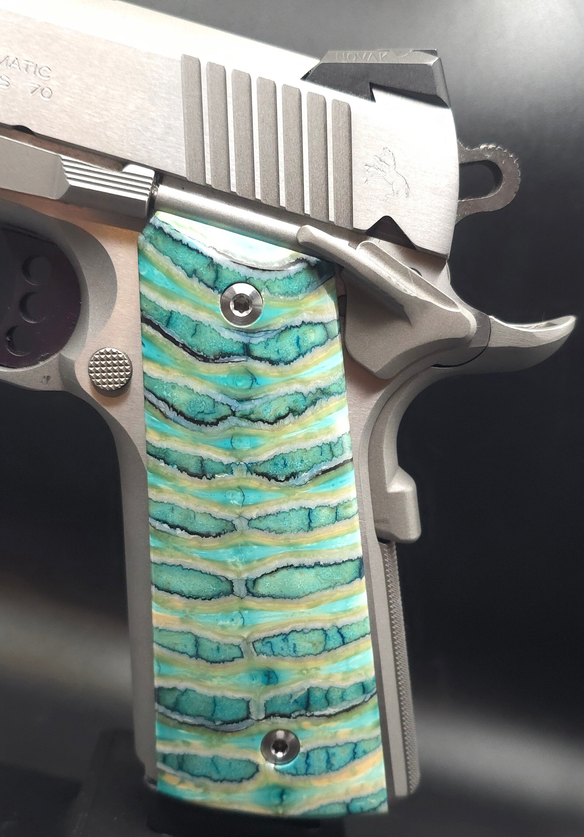 Transform your firearm with our stunning grips, meticulously handcrafted from authentic Woolly Mammoth molar. Each grip features a beautiful palette of light sage green hues almost a aqua marine color and some darker green colors elegantly highlighted by thin striking creamy colored veining. This rare coloration delivers a sophisticated and unique visual appeal, especially when matched with a stainless steel firearm, creating a bold and refined contrast that elevates your gun’s appearance. Pictures do not capture the beauty of this piece. You will be really happy with them once you see it in person.
