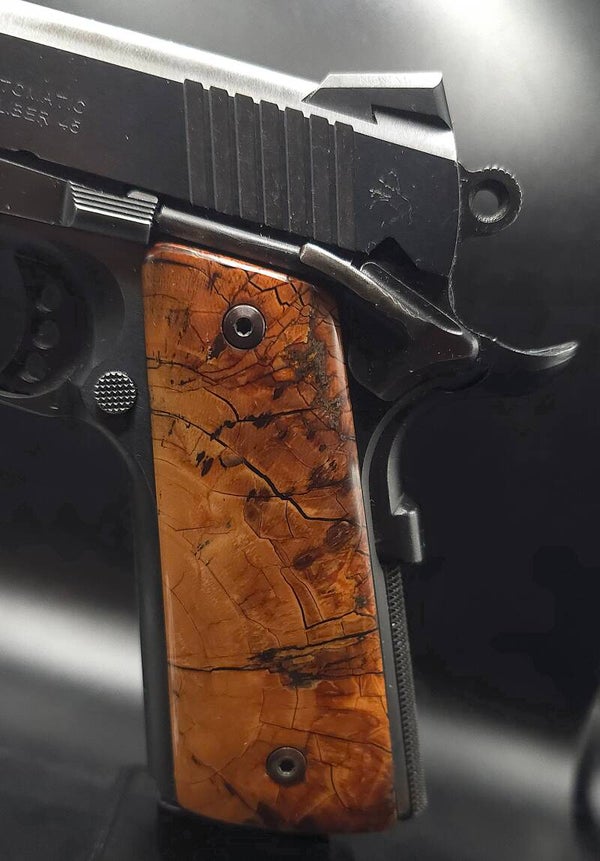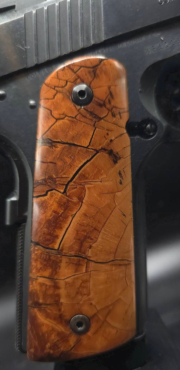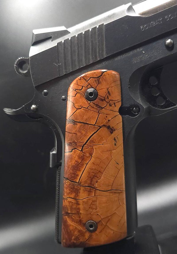 These are genuine woolly mammoth ivory tusk grips crafted for the classic 1911 pistol, offering an exceptional combination of rarity, history, and artistry. Featuring a distinctive darker golden honey color with spider web patterning, each grip is shaped and polished to reveal the unique Ice Age patterns—no two sets are alike.