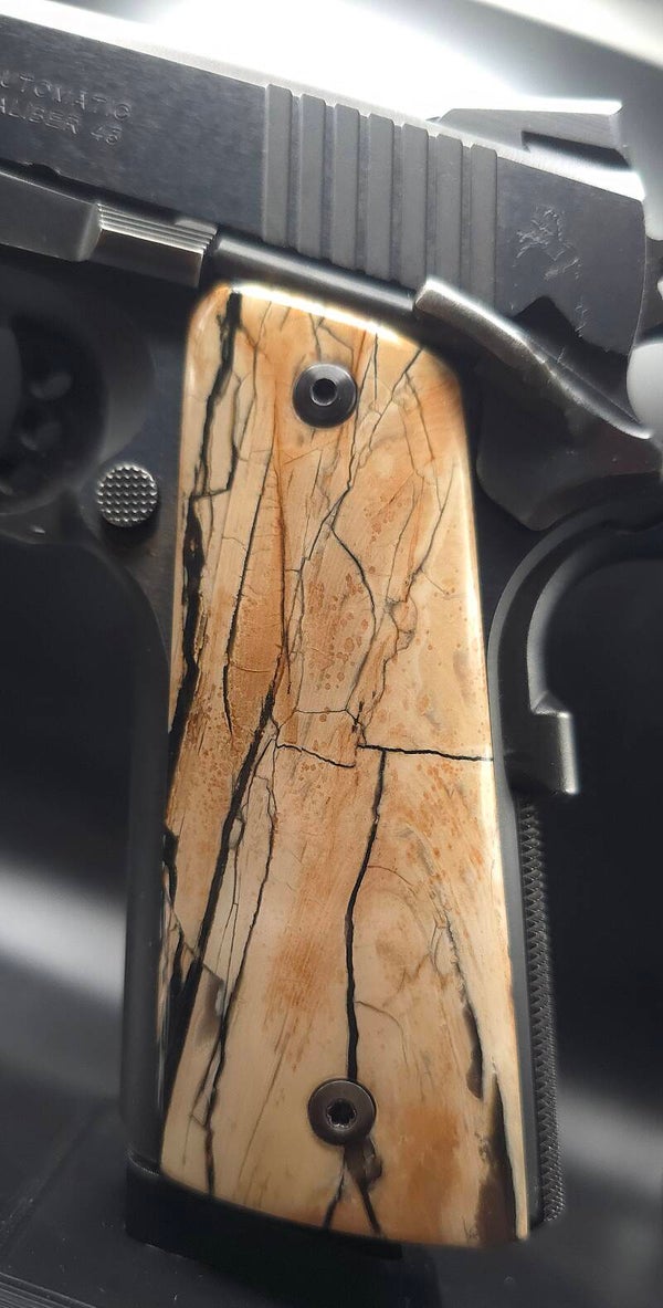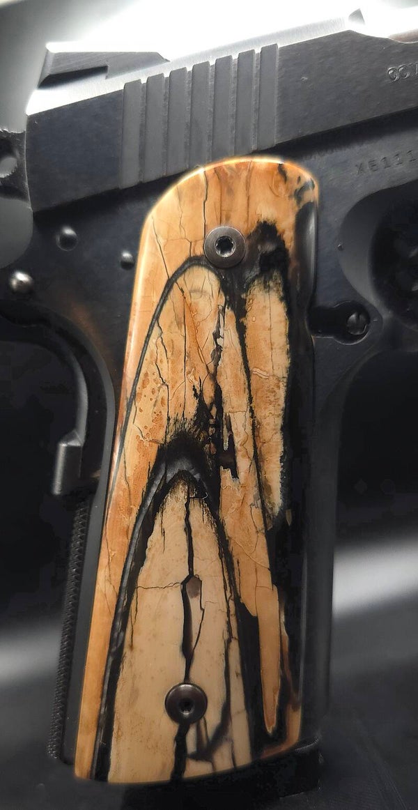 These are genuine woolly mammoth ivory tusk grips crafted for the classic 1911 pistol, offering an exceptional combination of rarity, history, and artistry. Featuring a distinctive pattern can be seen on these grips. The coloring is light tan, to medium brownish golden honey color with back patterns, each grip is shaped and polished to reveal the ivorys unique Ice Age patterns—no two sets are alike.