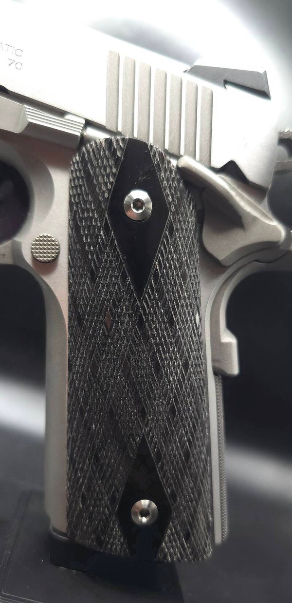 Give your 1911 a refined and timeless upgrade with our Custom Handmade Black Buffalo Horn Grips. Each set is carefully crafted from authentic buffalo horn, known for its striking deep black finish and natural luster. No two pieces are exactly alike, ensuring a truly unique look for your firearm. These are sold black buffalo horn and have a rich shine, custom fit, and bold style. These grips have been hand checkered with a skip line pattern making them unique and functional in guns with heavy recoil. These grips combine natural beauty and classic elegance for the perfect finishing touch.