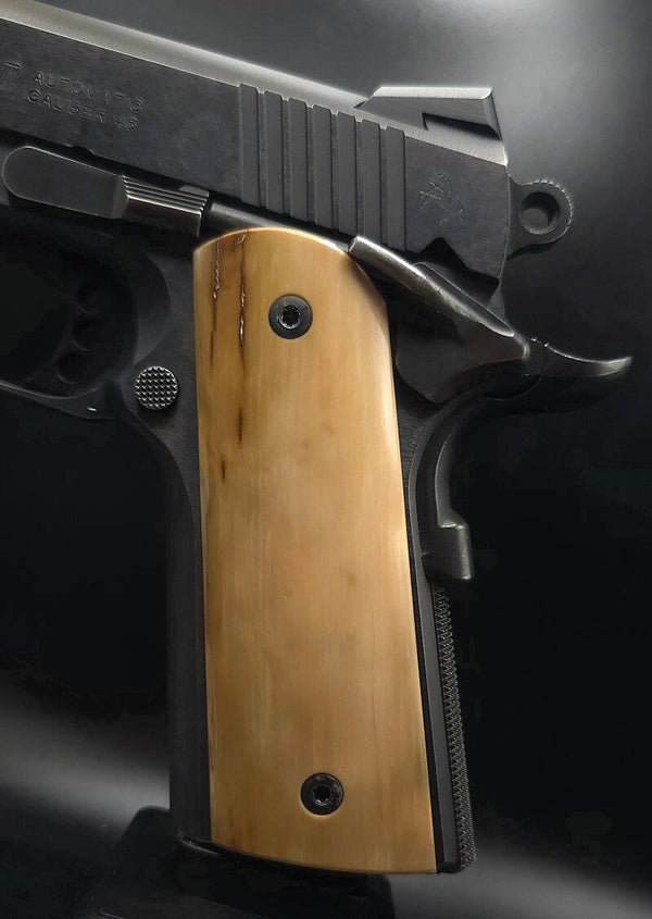 Each grip is shaped and polished by hand, ensuring a flawless fit on your 1911 and a smooth, comfortable feel in the palm. The mammoth ivory’s unique grain and coloration make these grips one-of-a-kind—no two sets will ever be exactly alike.