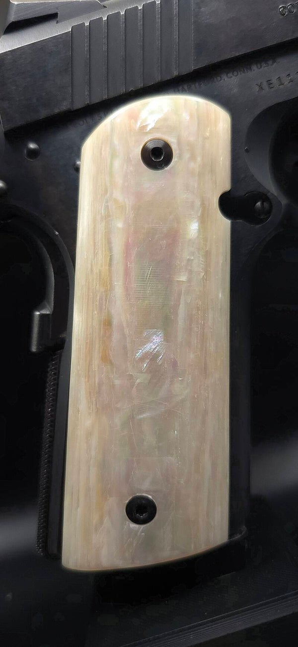 These exclusive Colt 1911 grips, crafted from genuine mother of pearl, represent the ultimate in luxury for collectors who demand excellence and rarity. With every angle, the grips reveal luminous green and pink highlights set against a backdrop of natural pearlescence, showcasing a depth and brilliance found only in authentic material.