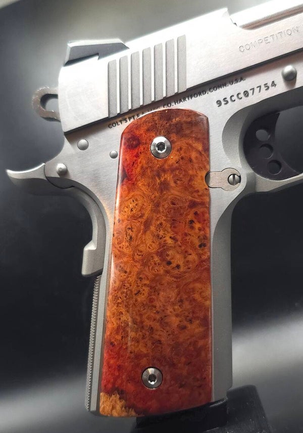 Upgrade your firearm with Multi-Colored Amboyna Burl Wood Grips-handmade in the USA for those who appreciate rare materials, vivid color, and masterful craftsmanship in every detail.